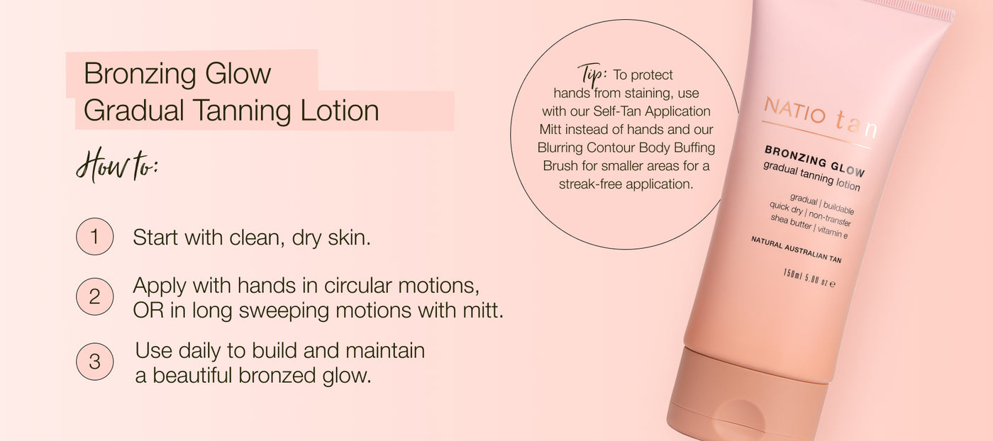 Apply evenly to clean, dry skin in circular motions. Use daily to build and maintain a beautiful bronze glow, all year round.