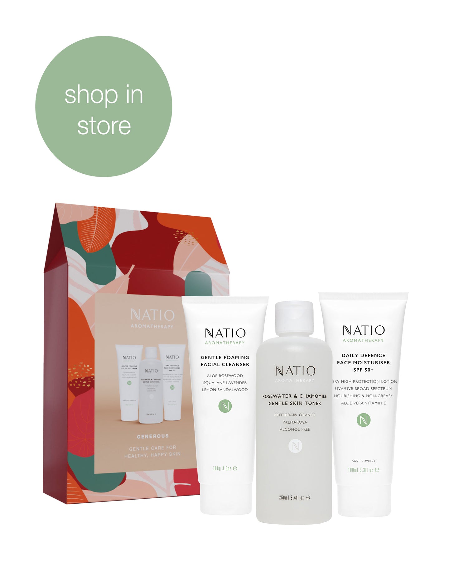 A gift of daily botanical goodness, purity and protection. 'Generous' gift set contains a perfectly protective trio, including the Aromatherapy Gentle Foaming Facial Cleanser, Rosewater and Chamomile Gentle Skin Toner and Daily Defence Face Moisturiser SPF 50+, presented in a complimentary Natio gift box.