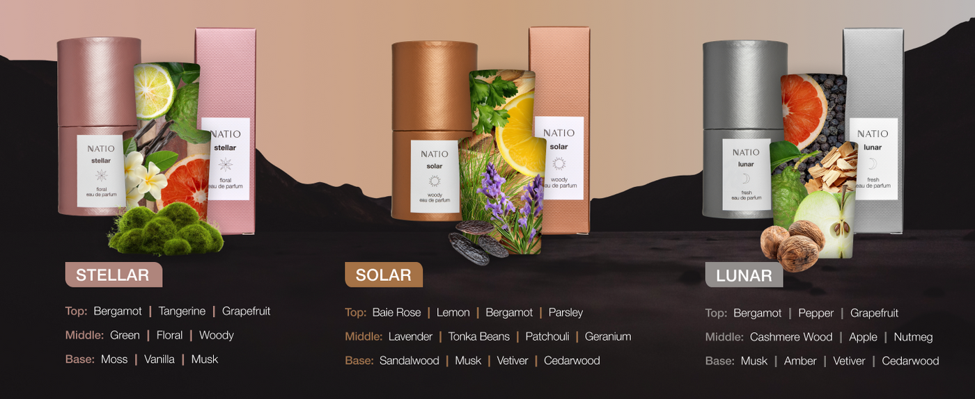 Inspired by the vast beauty, wonder and luminosity of the heavens above, Natio’s trio of eau de parfums honours three distinct celestial lights: sun, moon and stars. Each EDP fragrance is crafted to reflect its own mood and intensity, offering a long lasting personal perfume to suit your style, whether for everyday wear or special evening occasions.
