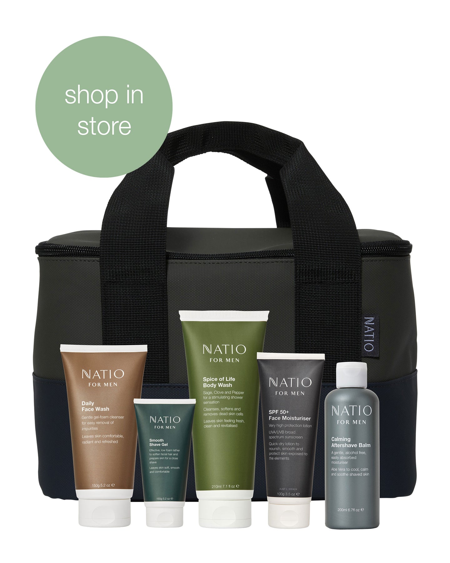 Packed with plant extracts to smooth and soften, refresh and revitalise, his skin and senses will be richly replenished using this suave swag of purifying and protective self-care essentials. 'Plenty' gift set includes a full size Natio for Men Daily Face Wash, travel size Smooth Shave Gel, full size Calming Aftershave Balm Spice of Life Body Wash and SPF 50+ Face Moisturiser, presented in a premium Natio cooler bag.