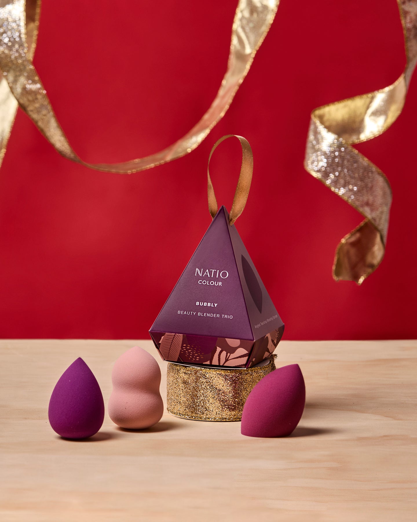 This bouncy trio of cute, cleverly contoured, professional finish sponges is a gift of effortless application. A must-have for beautiful beauty buffs, from beginner to expert. ‘bubbly’ gift set contains a Complexion Perfection Foundation Sponge, Teardrop Application Sponge and Angled Teardrop Blending Sponge, ready to gift in a Christmas tree-ready Natio hanging bauble gift box.