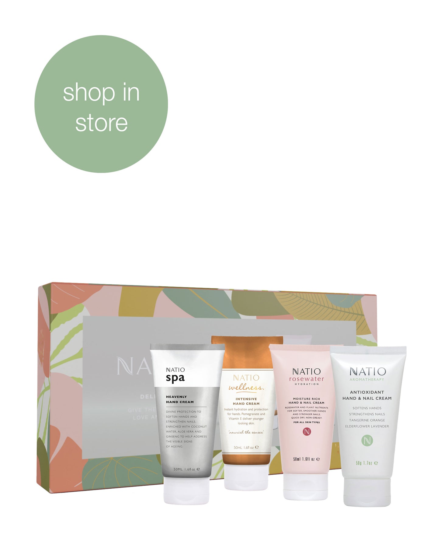 Lovers of little luxuries will adore this travel-sized quartet of naturally nourishing and aromatic hand creams. 'Delight' includes a travel-sized Spa Heavenly Hand Cream 50ml, wellness Intensive Hand Cream 50ml, Rosewater Hydration Moisture Rich Hand & Nail Cream 50ml and Aromatherapy Antioxidant Hand & Nail Cream 50g, ready to gift in a Natio presentation box.