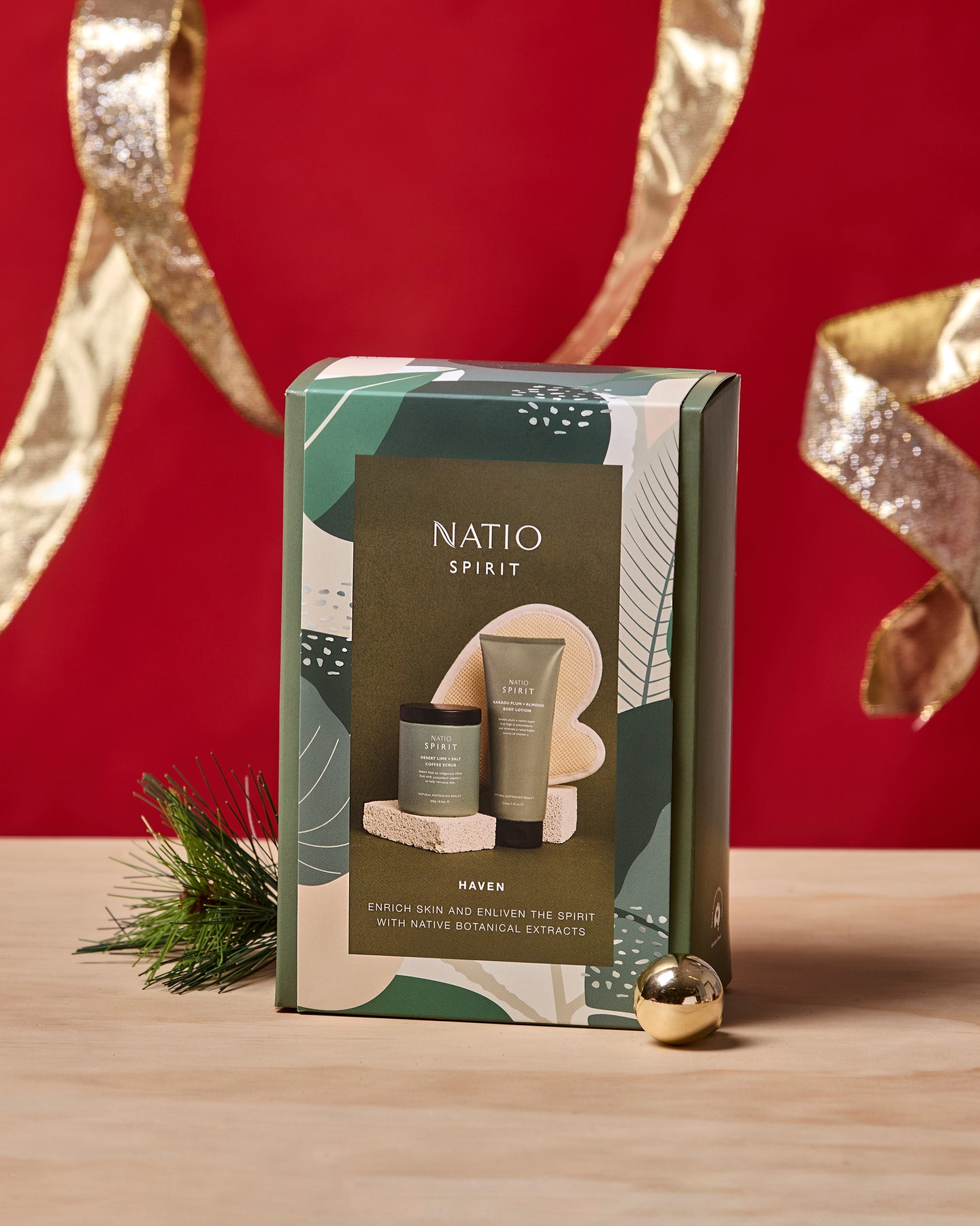 A gift of native Australian botanical nourishment and silky smooth, rejuvenated skin. 'Haven' gift set contains a full size Spirit Desert Lime + Salt Coffee Scrub and Kakadu Plum + Almond Body Lotion plus complimentary bath glove, presented in a Natio gift box.