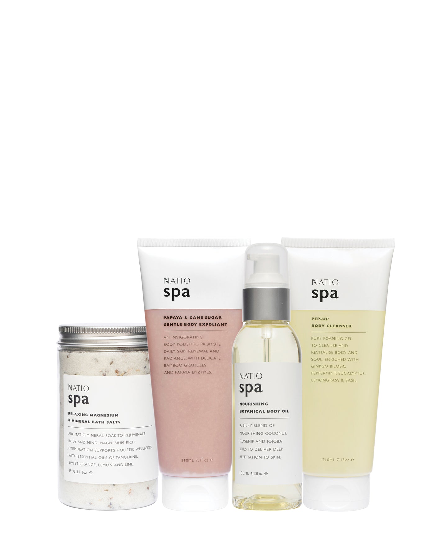 Steep their skin and senses in exotic, energising spa-style pampering with this lush bounty of bodycare treatments, luxuriously formulated with nurturing plant oils, butters and blissfully aromatic plant extracts. 'Revitalised' gift set includes customer favourites Spa Relaxing Magnesium & Mineral Bath Salts, Papaya & Cane Sugar Gentle Body Exfoliant, Nourishing Botanical Body Oil and Pep-Up Body Cleanser, presented in a premium Natio shopper tote bag.